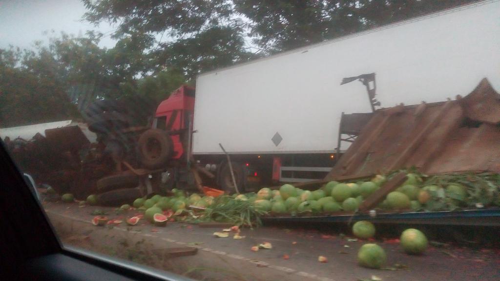 This is photo from scene of an accident involving a Trailer and a Bus believed to had happened in early hour of the day....See more photos below.. See more photos below....