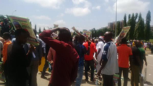 Hundreds of protesters on Tuesday barricaded the entrance of the National Assembly in Abuja singing solidarity songs in support of the embattled Senate President, Dr. Bukola Saraki. They also warned anti-graft agencies to desist from being used against perceived “political enemies.”