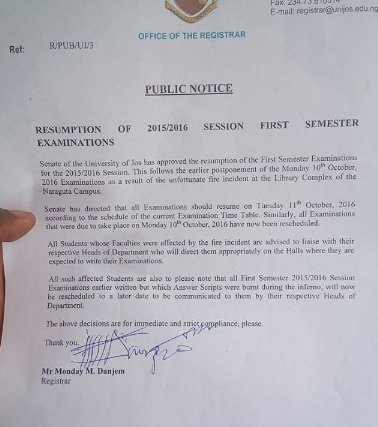 The management of UNIJOS has resumed earlier the first semester examination earlier called off due to the fire incident at the University Library. The examination according to circular begins today Tuesday 11 of October 2016. Also affect scripts affected by inferno will be rescued. Read full notice below....